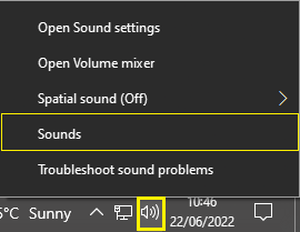 Right click the volume icon in the bottom right corner, and click ‘Sounds’.