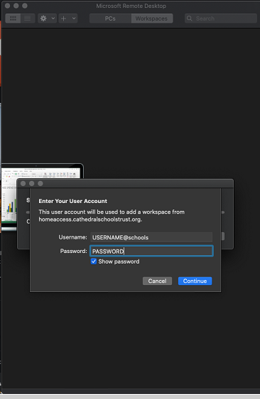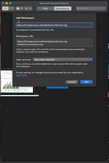 Step 3 - Add Workspace with the URL https://homeaccess.cathedralschoolstrust.org