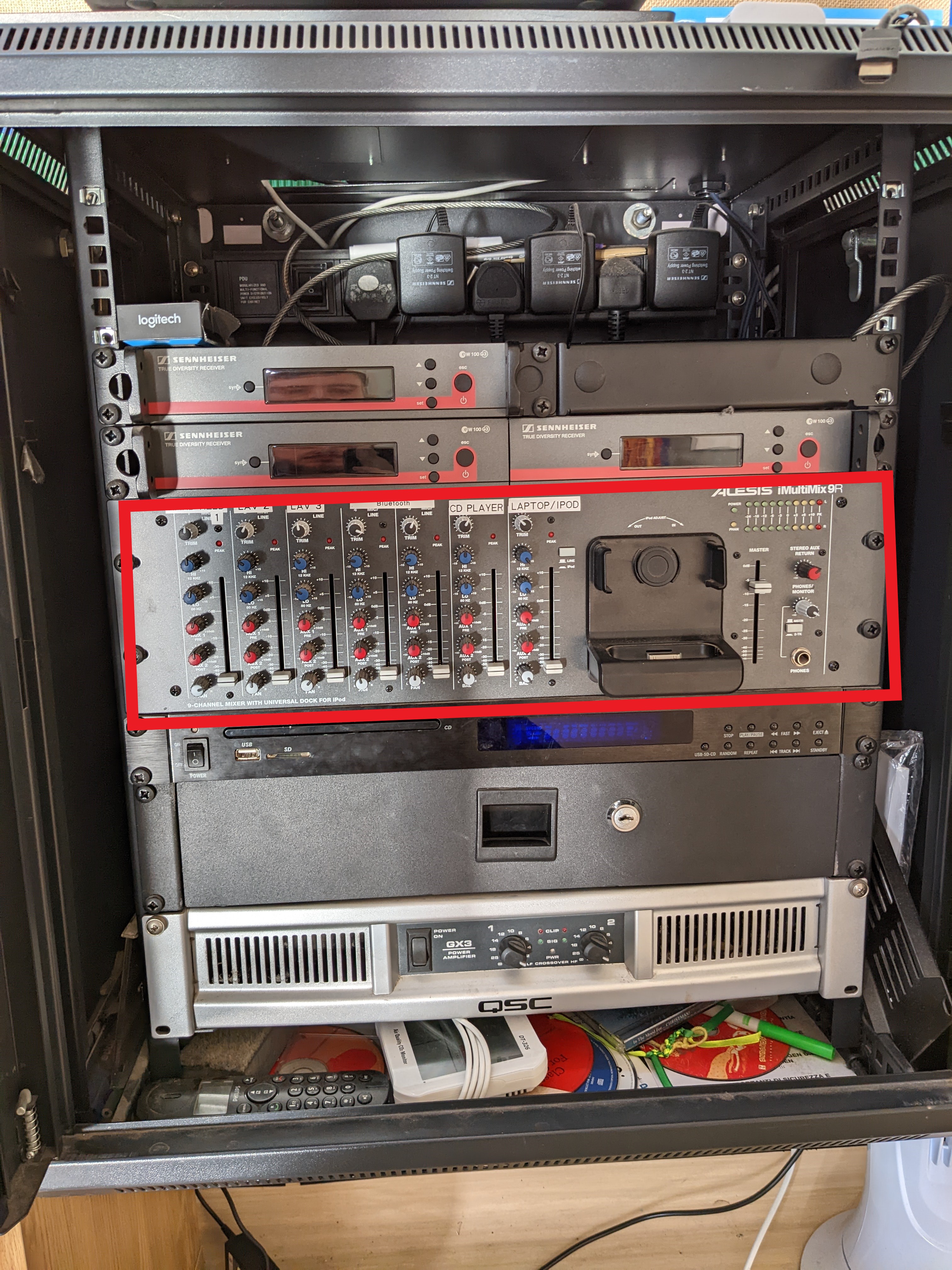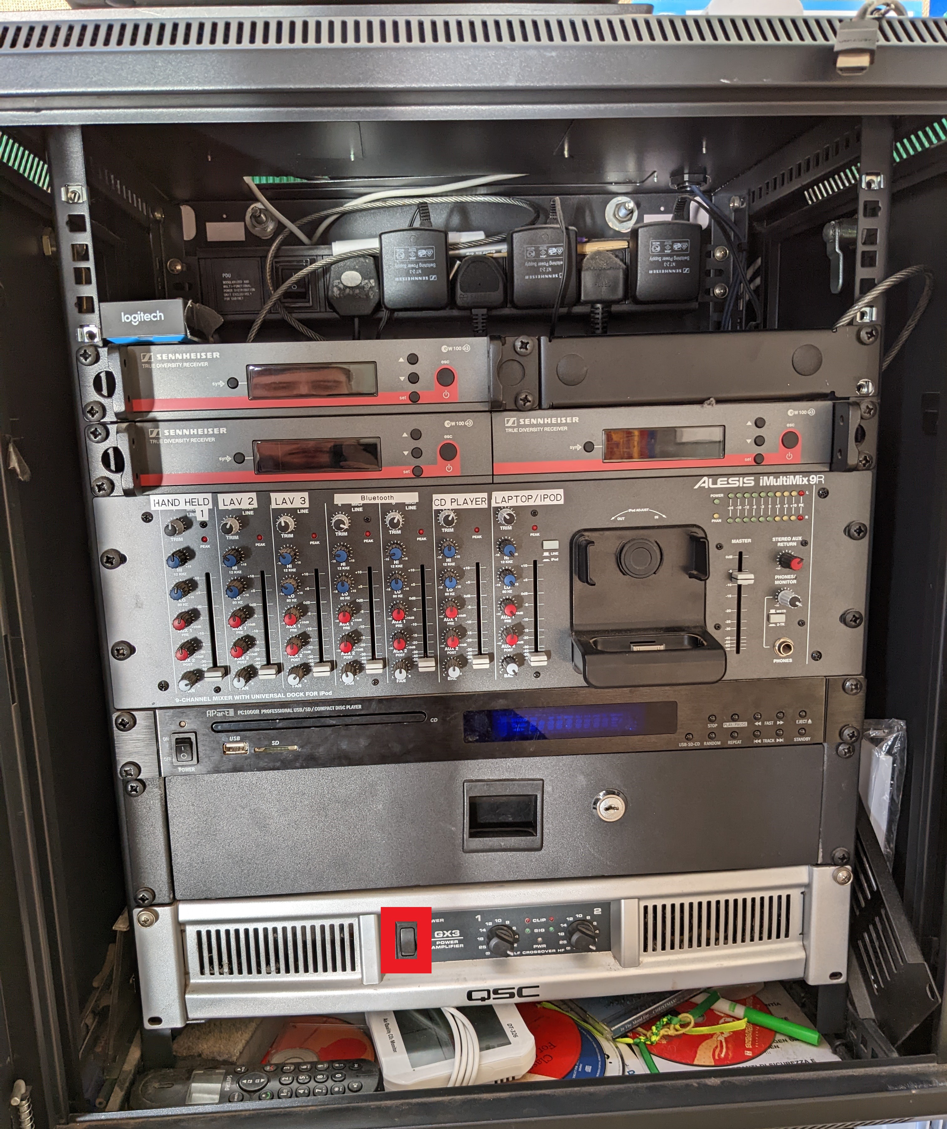 Step 1 - Turn on cab and sound system Marked with a RED Box (Plug just below AV unit) (Optional CD player, Switch on left front of unit)