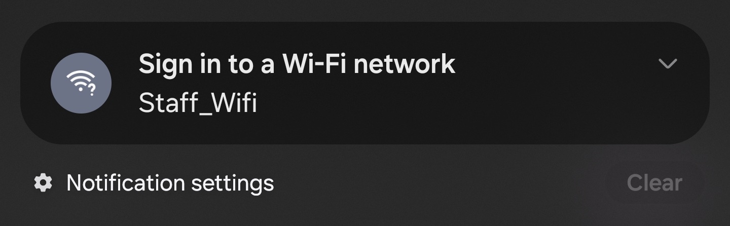 - Once connected, in the WiFi settings, there may be an option prompting you to sign in. By tapping/clicking this, it should take you to the correct page. Below is an example of what this might look like on an Android phone.