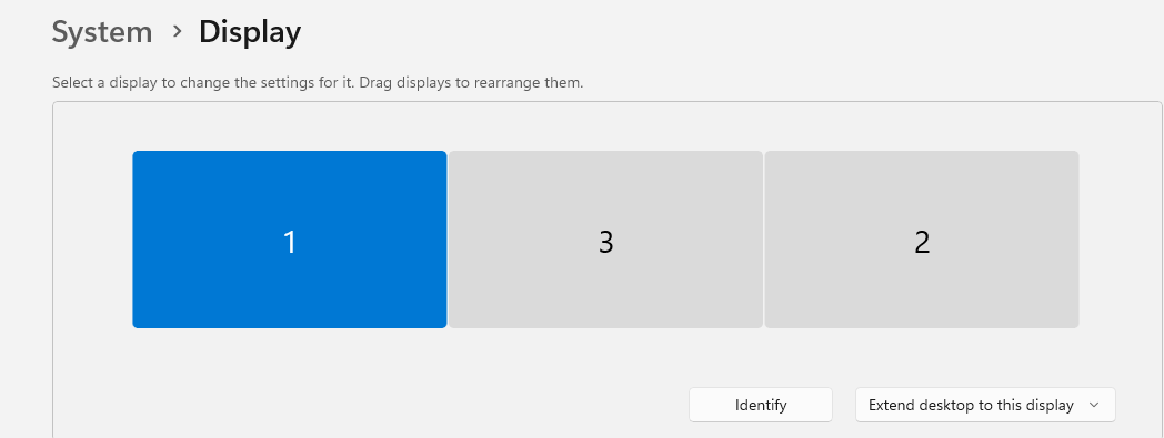 This will open the display menu, recognised monitors are numbered and shown in their virtual positions here. These positions can be changed by dragging them to the desired place. Pressing the identify button will show the corresponding numbers on the actual displays.